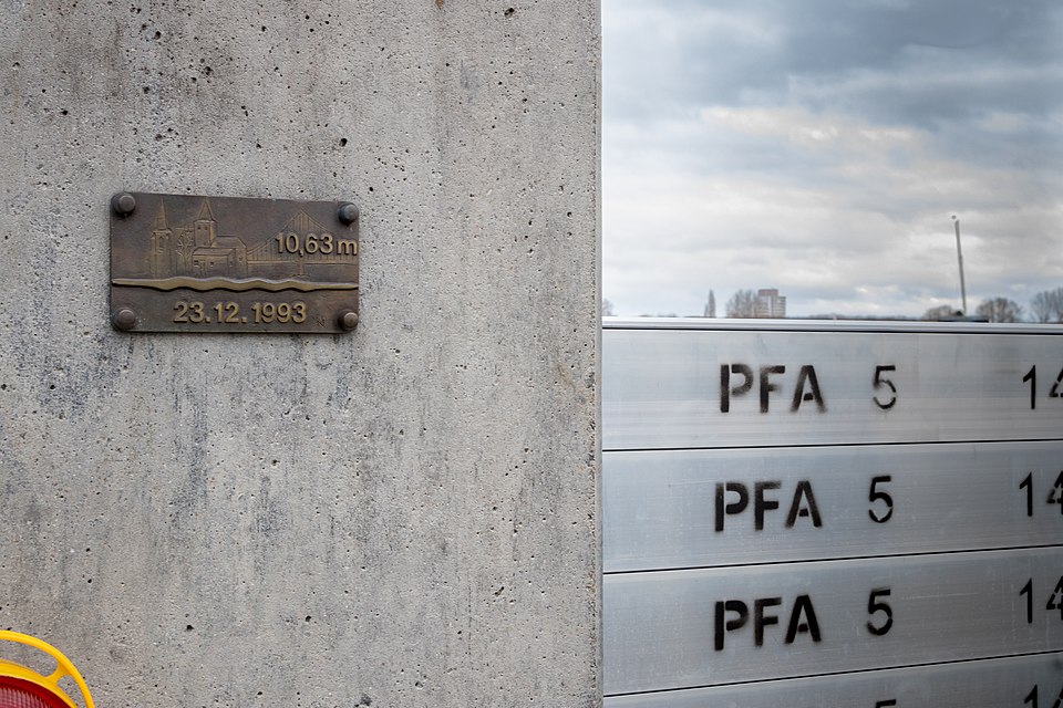 Image: Rhine flooding in Cologne in January 2018: Flood protection wall in Cologne-Rodenkirchen with flood markings on a house wall from 23 December 1993. © Superbass / CC BY-SA 4.0 (via Wikimedia Commons)
